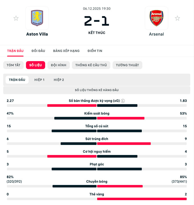 Kết quả Aston Villa 2-1 Arsenal: Pháo thủ gục ngã