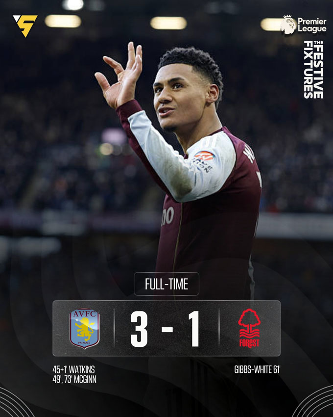 Aston Villa: Watkins (45+1'), McGinn (49', 73')