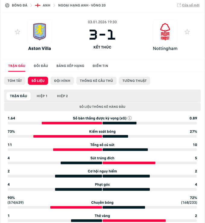 Chung cuộc, Aston Villa giành chiến thắng với tỷ số 3-1. Họ tạm thời vươn lên chiếm lấy vị trí thứ 2 và kém đội đầu bảng Arsenal đúng 3 điểm.