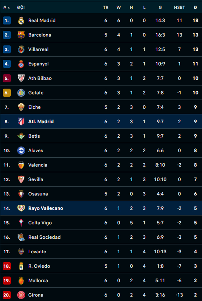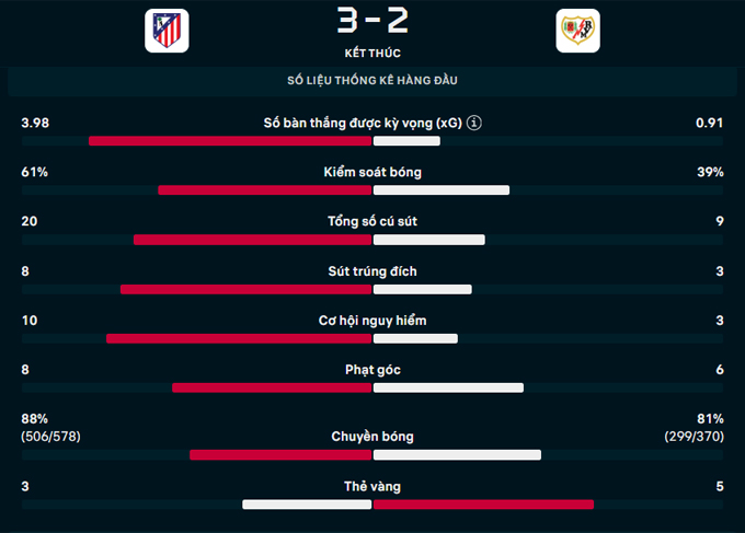 Trận thắng này giúp Atletico Madrid leo lên vị trí thứ 9 trên bảng xếp hạng La Liga với 9 điểm. Trong khi đó, Rayo Vallecano đứng hạng 14 khi có 5 điểm.
