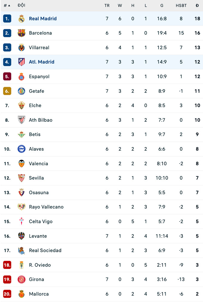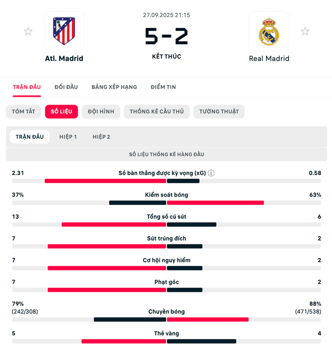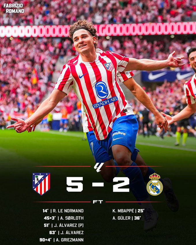 Không những vậy, tới phút bù giờ thứ 4 của hiệp 2, cầu thủ vào sân thay người là Griezmann còn ghi thêm bàn thắng để ấn định chiến thắng 5-2 cho Atletico. Kết quả này khiến Real chỉ còn hơn Barca 2 điểm nhưng đang đá nhiều hơn 1 trận. Trong khi đó, Atletico leo lên vị trí thứ 4 với 12 điểm, kém Real 6 điểm.