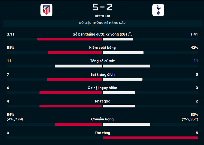 Trận đấu khép lại với thất bại muối mặt 2-5 cho Tottenham. Lợi thế quá lớn cho Atletico trước trận lượt về tại nước Anh.