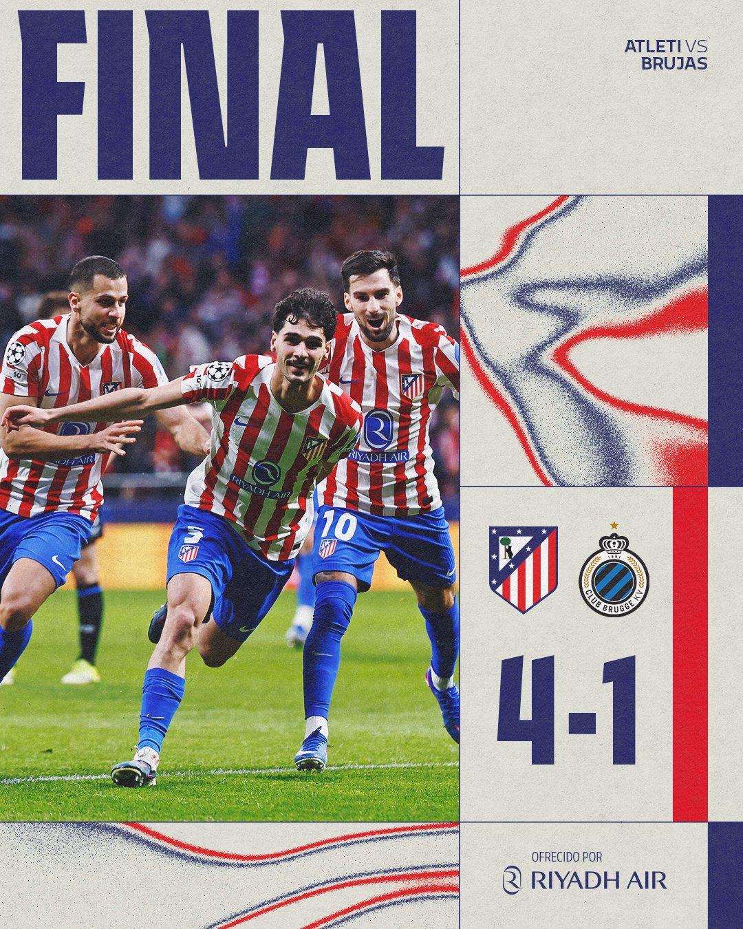 Thắng 4-1 ở lượt về và vượt qua Club Brugge với tổng tỷ số 7-4 sau 2 lượt đấu, Atletico vào vòng 1/8. Theo lịch, Atletico sẽ gặp một trong hai đại diện nước Anh: Liverpool hoặc Tottenham.