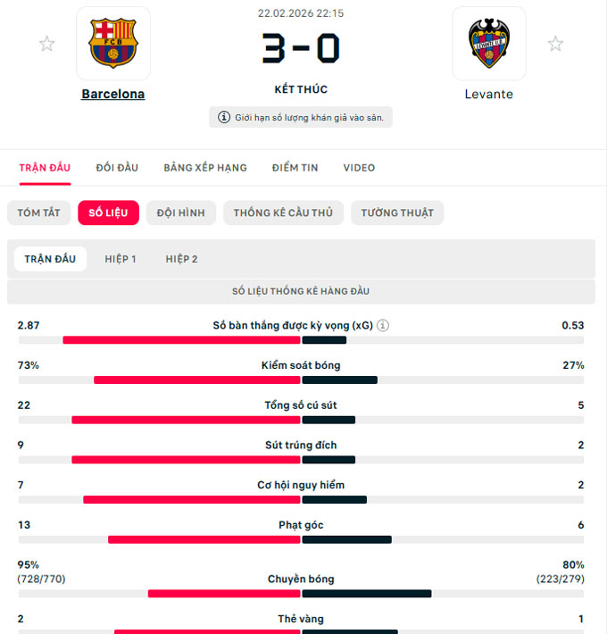 Sang hiệp hai, Barca tiếp tục cho thấy sự vượt trội khi kiểm soát nhịp độ trận đấu. Cũng cần thấy rằng, Levante đã thi đấu khá nỗ lực. Tuy nhiên, sự thiếu sắc bén từ các mũi nhọn trên hàng công Levante đã khiến cơ hội dần trôi qua trước mũi giày của họ. Ở chiều ngược lại, Barca đã có bàn nâng tỷ số lên 3-0 ở phút 81 nhờ công của Fermin Lopez. Xuất phát từ đường kiến tạo của Lamine Yamal, Lopez tung cú sút xa đầy uy lực, bóng đập cột dọc trước khi bay vào lưới.