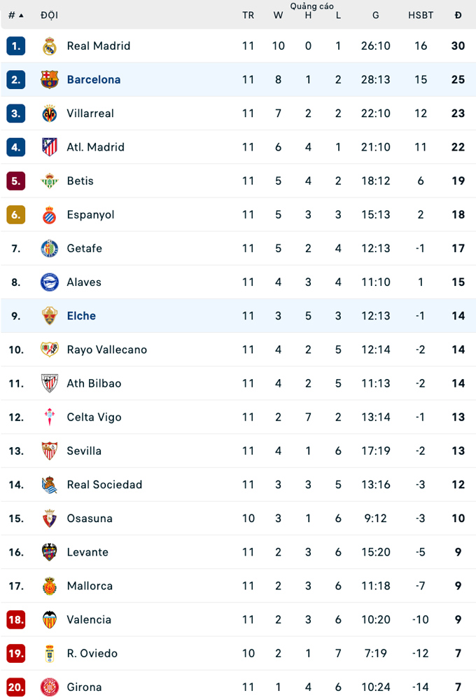 | TT | Đội bóng | Trận | +/- | Điểm |