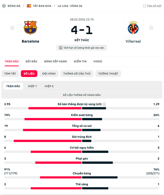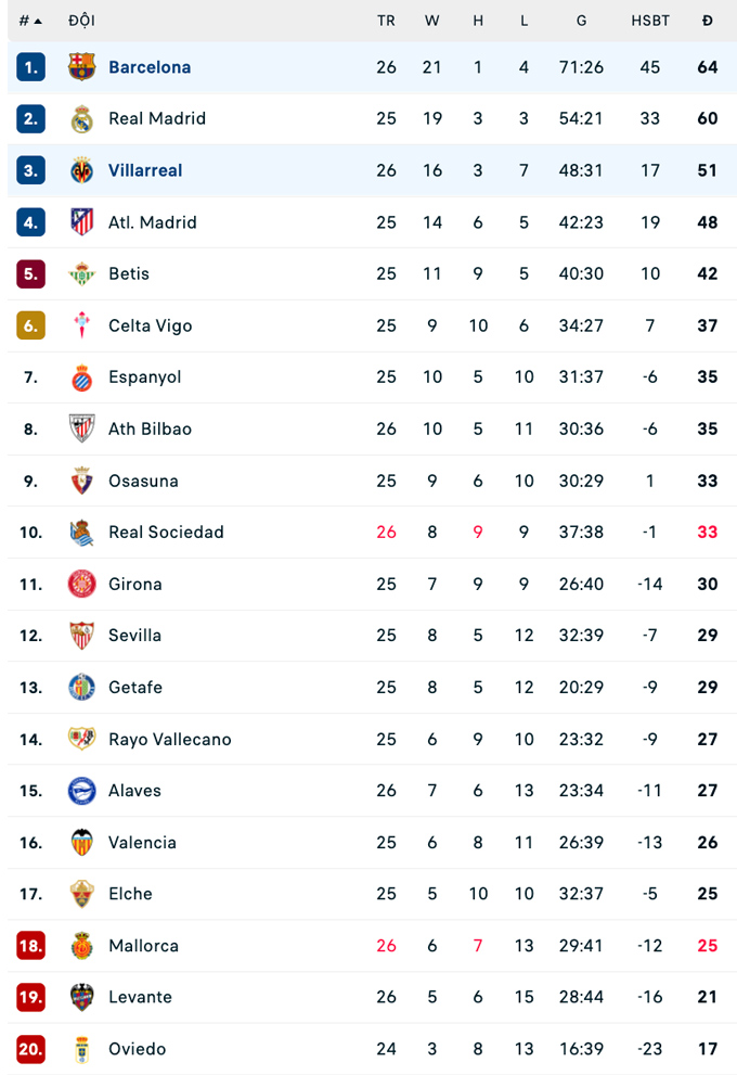 | La Liga - Vòng 26 | |||