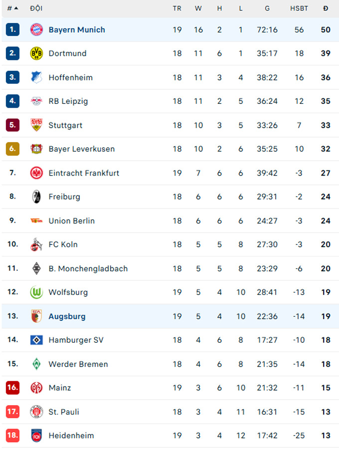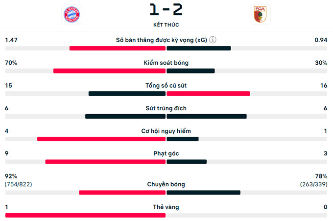 Chung cuộc, Bayern nhận thất bại sốc 1-2 trước Augsburg ngay trên sân nhà. Đây là trận thua đầu tiên của thầy trò Kompany ở Bundesliga mùa này sau chuỗi 16 chiến thắng cùng 2 trận hòa.