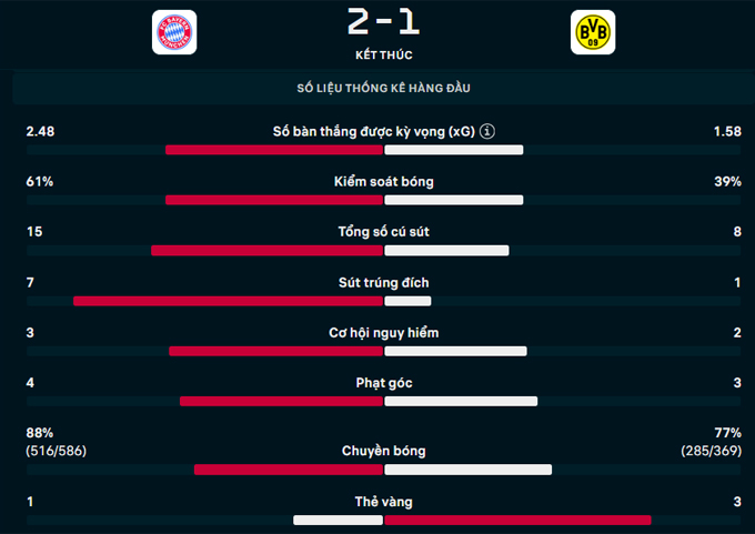 Trong thời gian còn lại của trận đấu, Dortmund chỉ kịp ghi 1 bàn khi Brandt tỏa sáng ở phút 85. Chung cuộc, Dortmund thua 1-2 trước Bayern Munich.