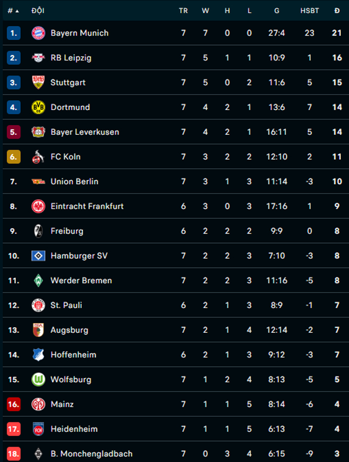 Chiến thắng trước Dortmund giúp Bayern Munich củng cố ngôi đầu Bundesliga khi nắm trong tay 21 điểm sau 7 vòng đấu. Còn Dortmund từ thứ 2 tụt xuống xếp hạng 4 khi sở hữu 14 điểm.