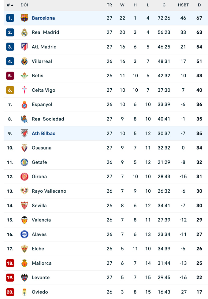 | La Liga - Vòng 27 | |||