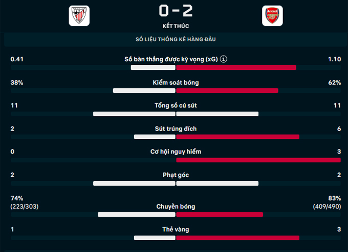 Chung cuộc, Arsenal khởi đầu suôn sẻ tại Champions League 2025/26 với chiến thắng 2-0 trên đất Tây Ban Nha. Ở lượt trận thứ 2, Arsenal sẽ gặp Olympiakos còn Bilbao đối đầu Dortmund.