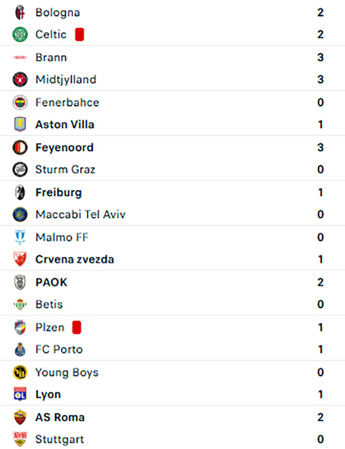 Ở một trận đấu đáng chú ý khác, Celtic chỉ kiếm được trận hòa 2-2 trước Bologna. Kết quả này khiến họ chỉ đứng thứ 23 trên BXH, qua đó đối mặt với nguy cơ bị loại trong bối cảnh phía trước chỉ còn 1 lượt đấu.