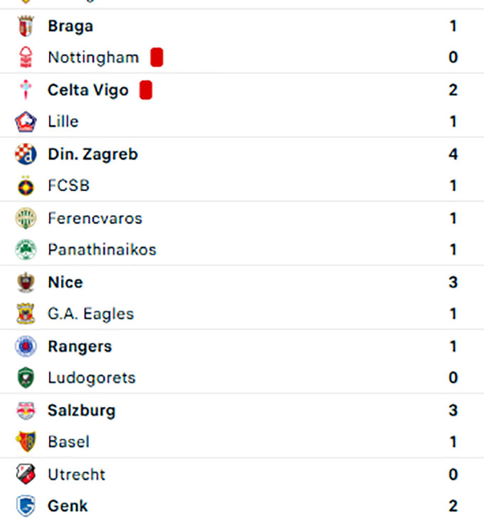 Một đại diện khác của xứ sở sương mù là Nottingham Forest lại gây thất vọng khi thất thủ 0-1 dưới tay Sporting Braga. Đây là trận đấu mà ngay sau khi Gibbs-White đá hỏng phạt đền cho Nottingham Forest, các vị khách đã để thủng lưới vì pha đá phản lưới nhà của Ryan Yates. Đã vậy, khi trận đấu sắp kết thúc Nottingham Forest còn thiệt quân do Anderson phải nhận thẻ đỏ.