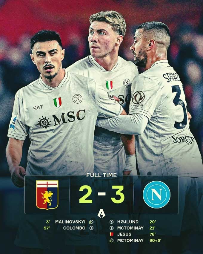 Tại vòng 24 Serie A, Napoli đánh bại Genoa với tỷ số 3-2 trong khi Fiorentina và Torino cầm hòa nhau với tỷ số 2-2.