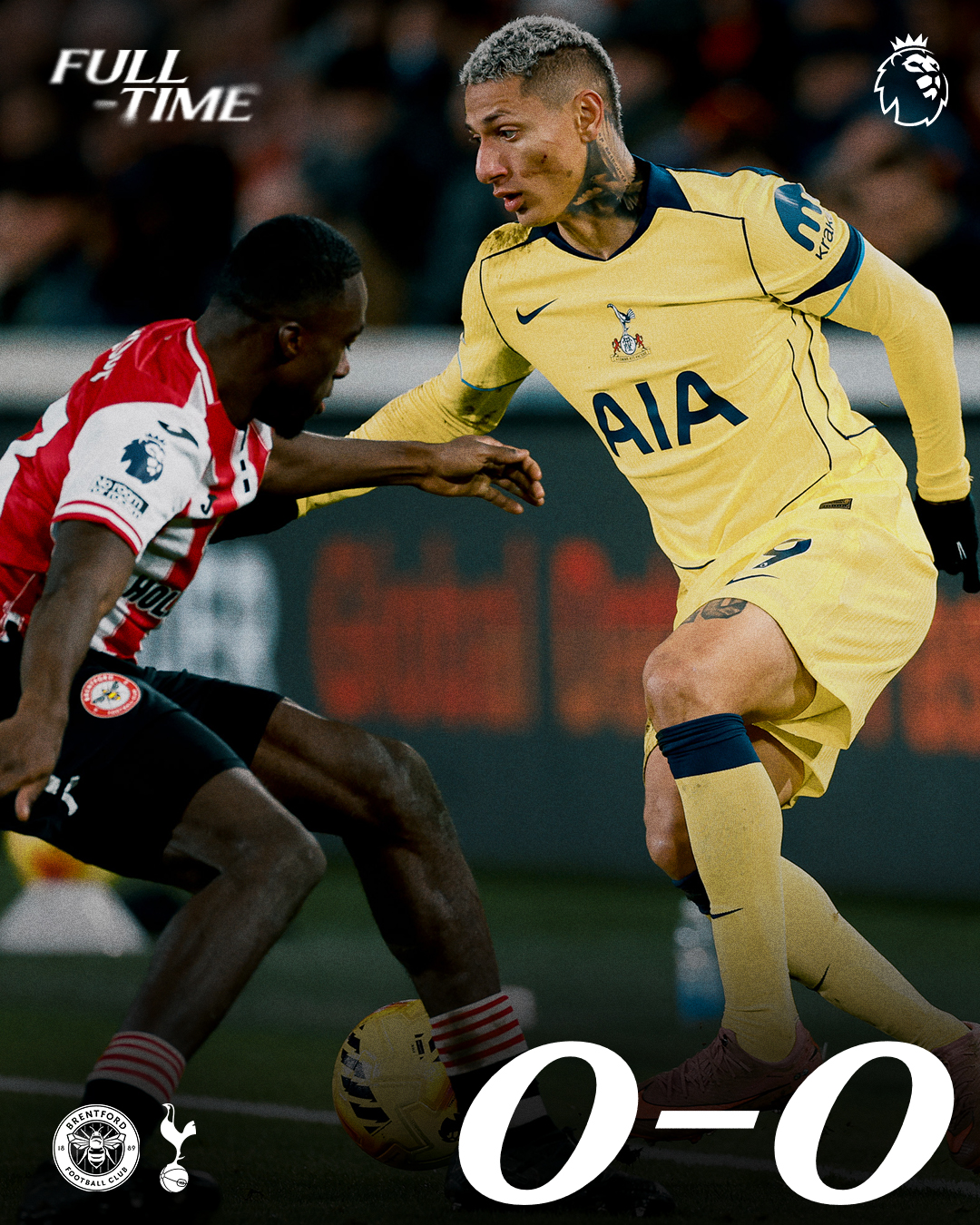 Phút 32, Richarlison đã có cú tâng cho Archie Gray đánh đầu trong vòng cấm Brentford, nhưng Collins đã chắn bóng kịp thời để giải nguy. Hai đội kết thúc hiệp 1 mà không ghi được bàn.