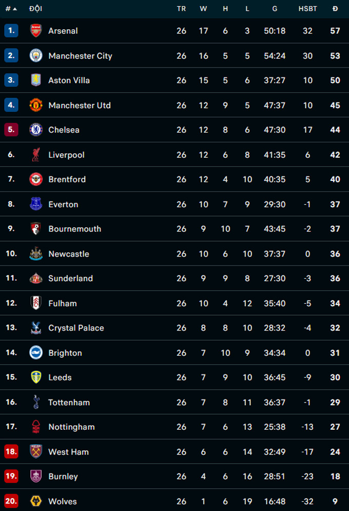 | Premier League - Vòng 26 | |||