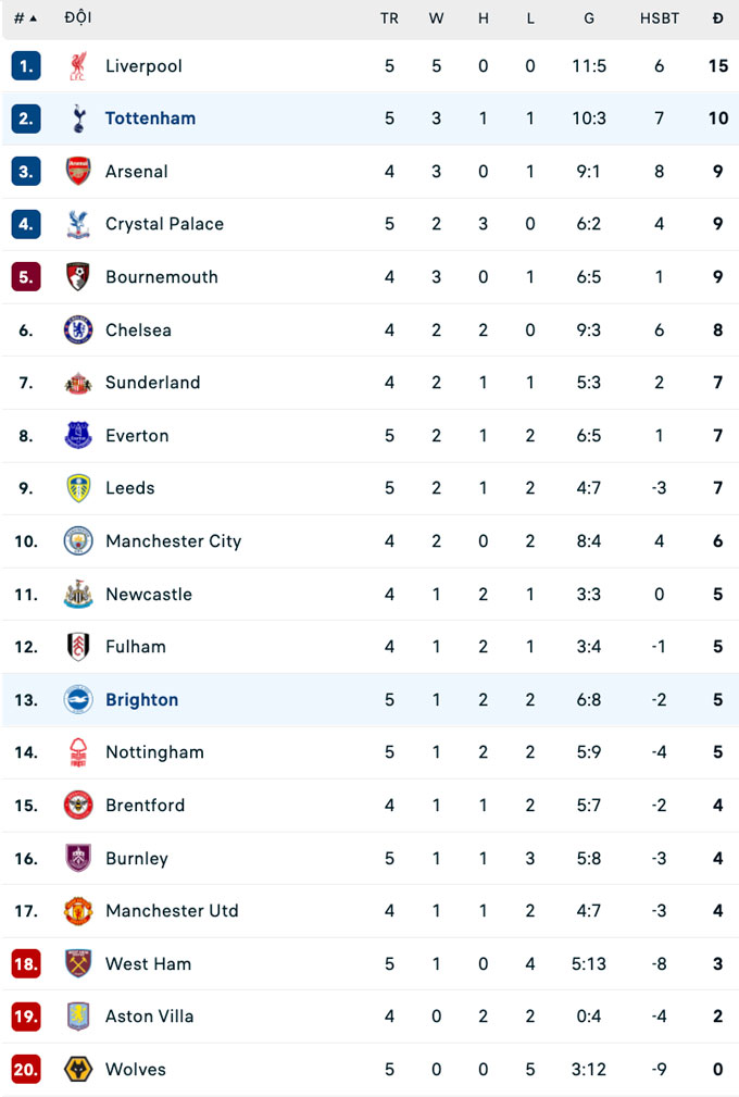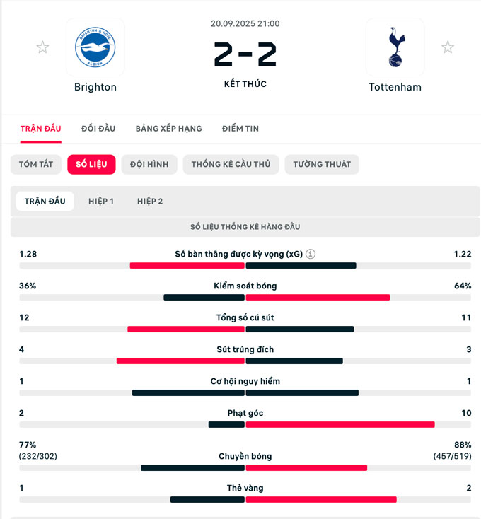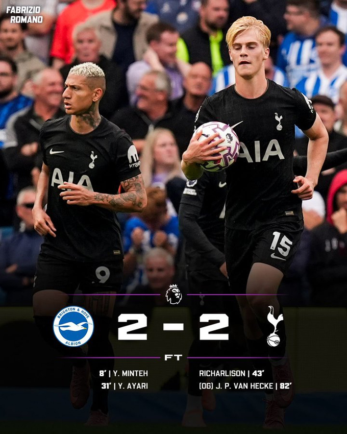 Kết quả cuối cùng của trận đấu này là 2-2. Tottenham may mắn có được 1 điểm rời sân The Amex còn Brighton chỉ biết trách mình quá đen đủi.