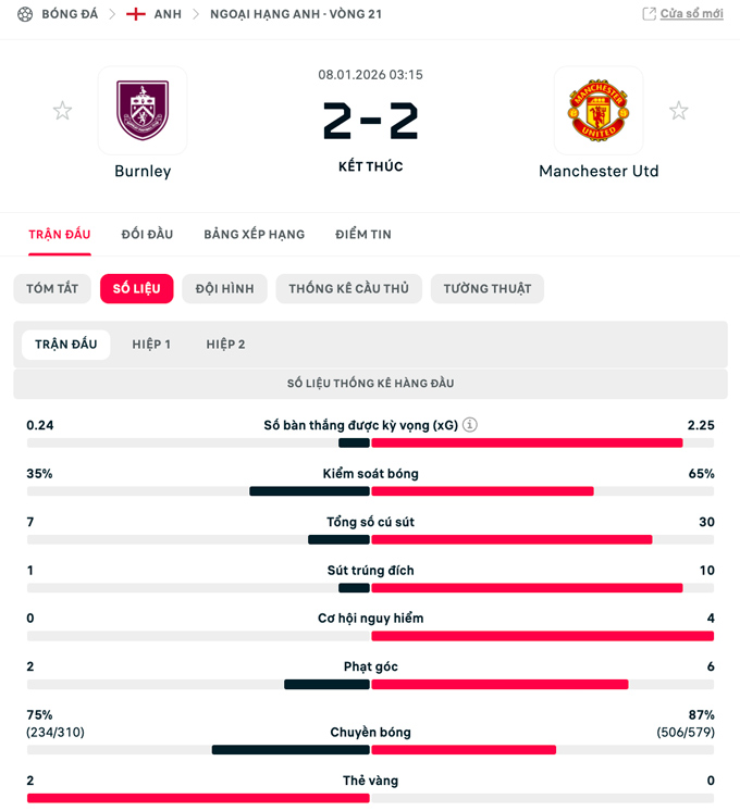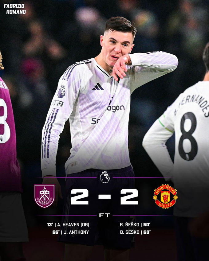 Kết quả Burnley 2-2 MU: Sesko cứu thầy mới Fletcher