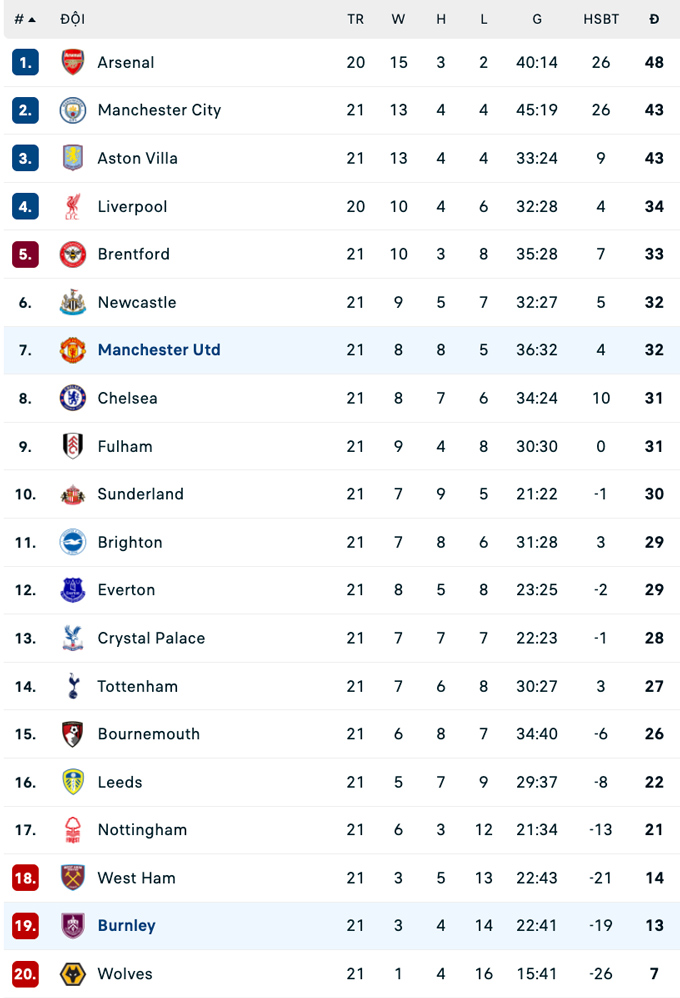 | Premier League - Vòng 21 | |||
