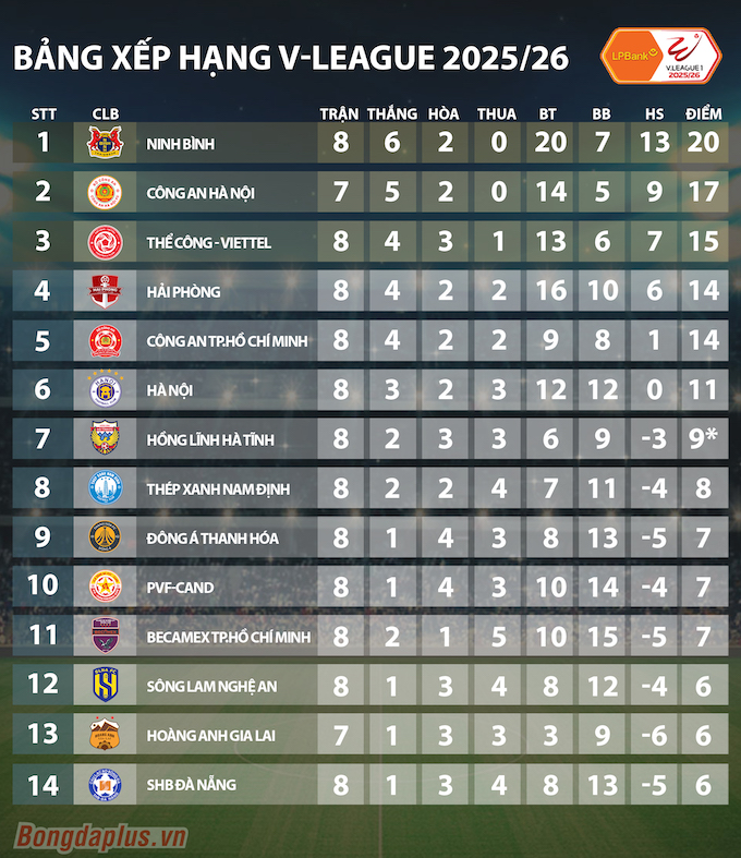 | TT | Đội bóng | Trận | +/- | Điểm |