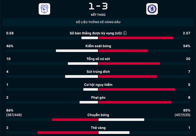 Nhiều cơ hội ngon ăn được Cardiff tạo ra nhưng họ lại liên tục bỏ lỡ. Trong khi đó, Chelsea cũng có những thời cơ nhất định ở hiệp một nhưng không thể tận dụng được.