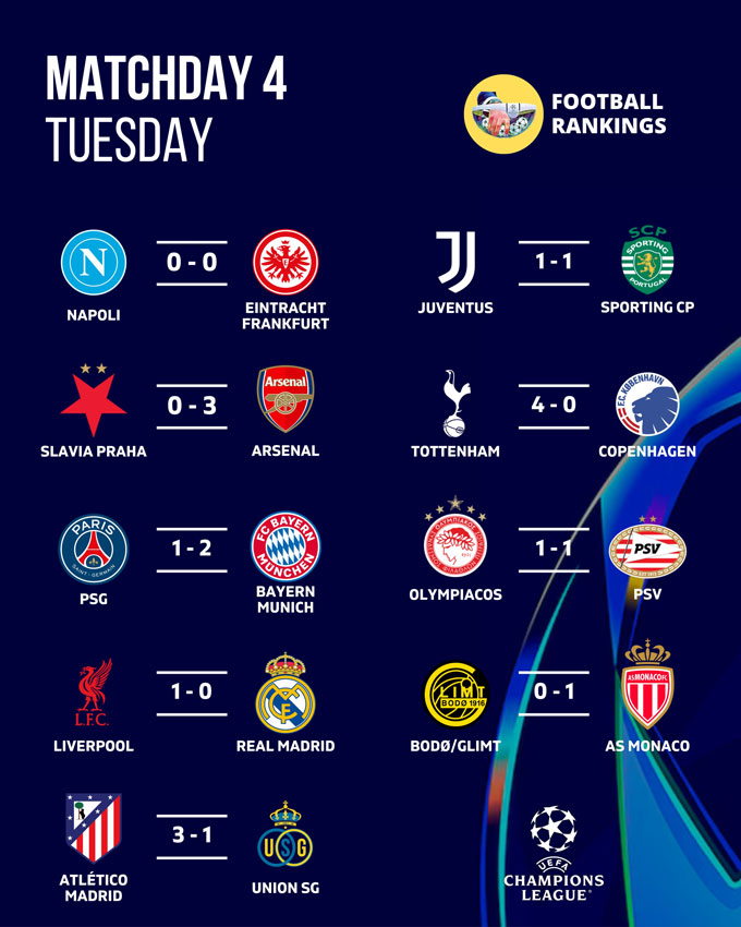 Ở các trận đấu còn lại, Monaco thắng Bodo/Glimt với tỷ số 1-0 trong khi Olympiacos và PSV Eindhoven hoà nhau với tỷ số 1-1.