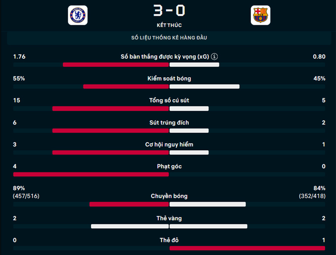 Kết quả này giúp Chelsea leo lên xếp thứ 5 trên BXH Champions League 2025/26 khi có 10 điểm sau 5 lượt đấu còn Barca rơi xuống thứ 15 với 7 điểm.