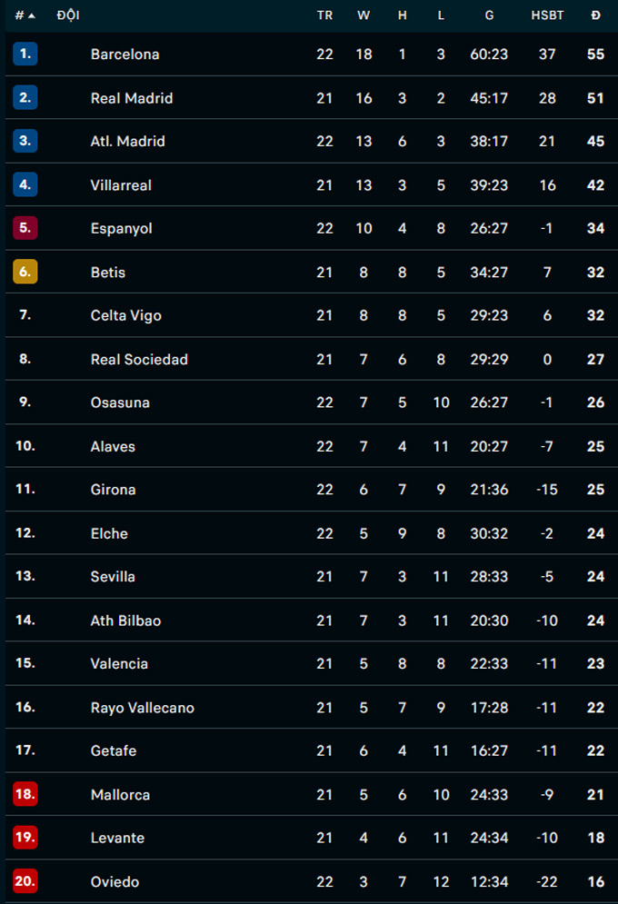 | La Liga - Vòng 22 | |||