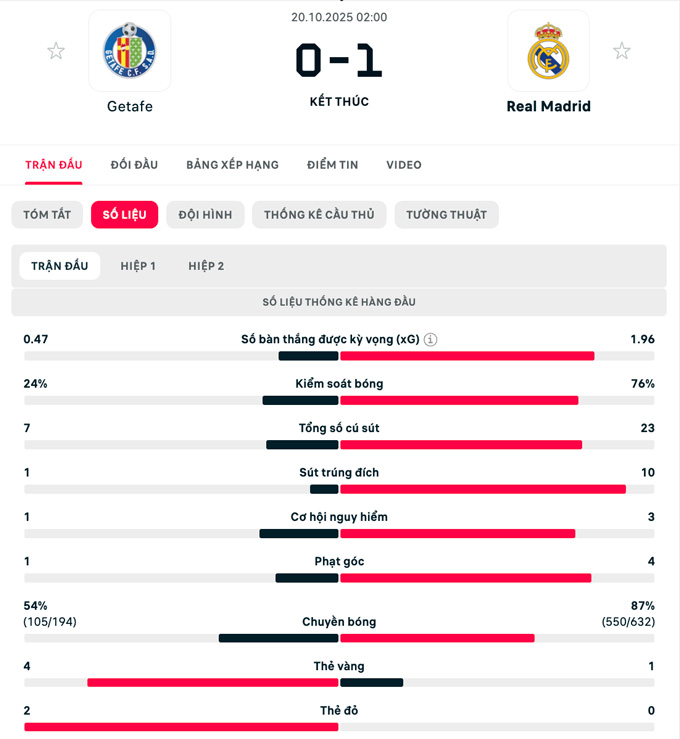 Getafe tiếp tục tự đẩy mình vào thế khó, khi Alex Sancris nhận thẻ vàng thứ hai sau pha phạm lỗi vô nghĩa khác với Vinicius ở phút 84, khiến đội chủ nhà chỉ còn 9 người trên sân.