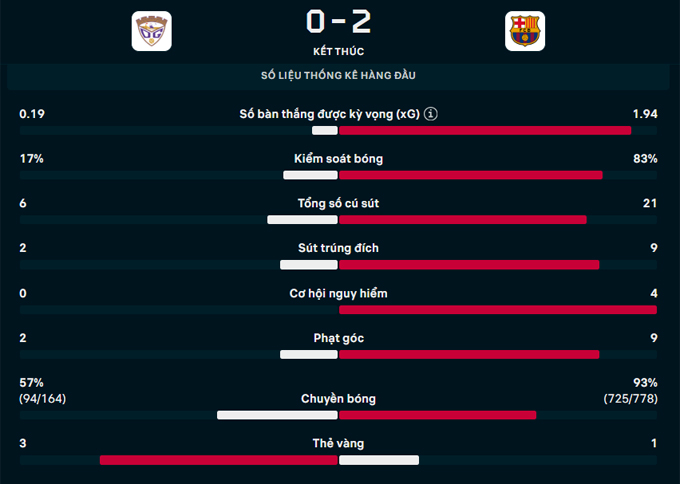Dù vượt lên nhưng Barca không dễ đá hơn nởi chỉ 2 phút sau chủ nhà phản công và phải nhờ Ter Stegen bay người cản phá cú sút xa của Salifo Caropitche, đội ĐKVĐ mới thoát khỏi 1 bàn thua. Cuối trận, Rashford ấn định thắng lợi 2-0 cho Barca khi bình tĩnh đi bóng qua thủ môn rồi sút vào lưới trống.