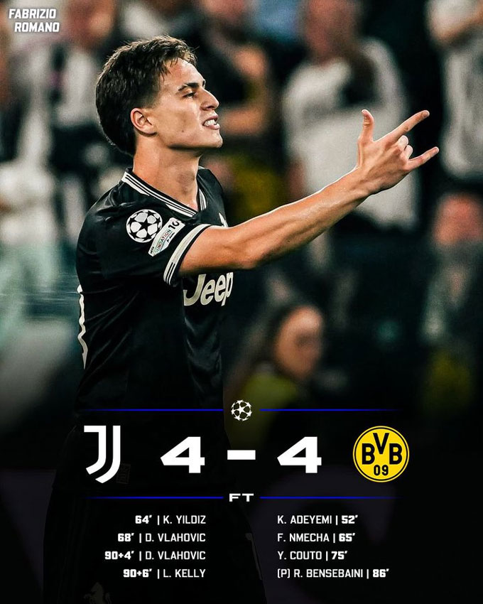 Trận đấu tưởng như đã được an bài khi Couto và Bensebaini lần lượt ghi bàn cho Dortmund ở các phút 74 và 86, qua đó giúp đội khách dẫn 4-2 trước Juventus.