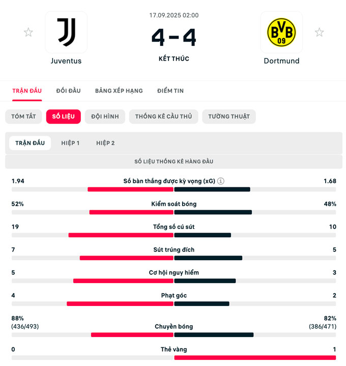 Cầm chân nhau trong cơn mưa bàn thắng, Dortmund và Juventus lần lượt tạm xếp thứ 6 và thứ 7 tren BXH phân hạng Champions League 2025/26.