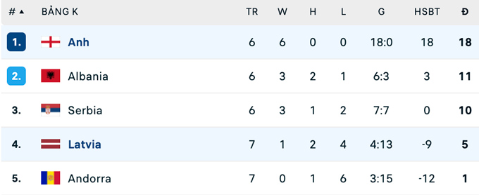 Chiến thắng 5-0 giúp ĐT Anh củng cố ngôi đầu bảng K với thành tích toàn thắng, ghi 18 bàn và chưa để lọt lưới bàn nào sau 6 trận. Tam Sư chính thức giành vé dự World Cup 2026.
