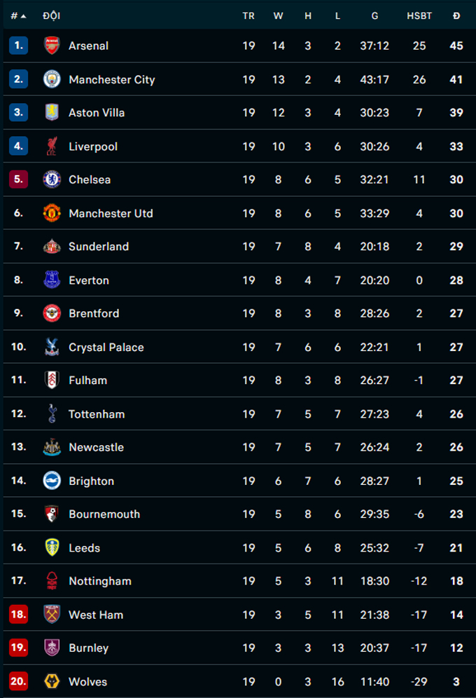 | Premier League - Vòng 19 | |||