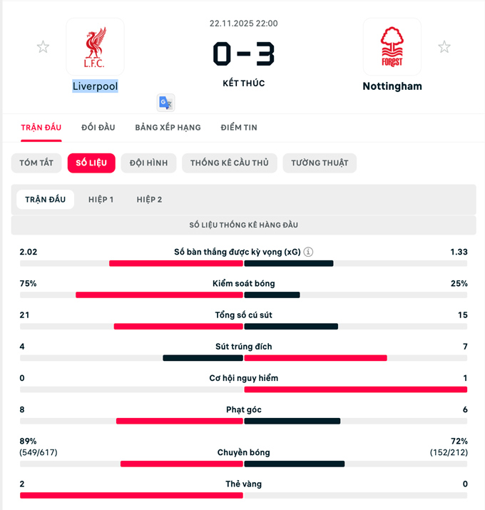 Trận thua này khiến Liverpool chìm sâu vào đáy khủng hoảng trong khi Nottingham dần tìm lại cơ hội để trụ hạng tại Premier League mùa này.