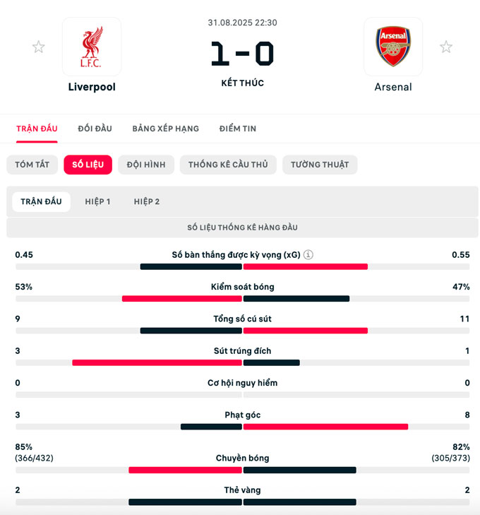 Kết quả cuối cùng của trận đấu này là 1-0 nghiêng về phía Liverpool. Đội bóng vùng Merseyside độc chiếm ngôi đầu với 9 điểm tuyệt đối sau 3 trận. Trong khi đó, Arsenal tụt xuống thứ 3 với 6 điểm, kém Chelsea 1 điểm.