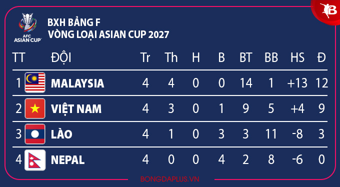 | TT | Đội bóng | Trận | +/- | Điểm |