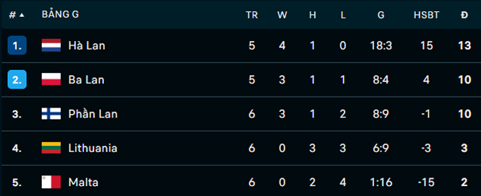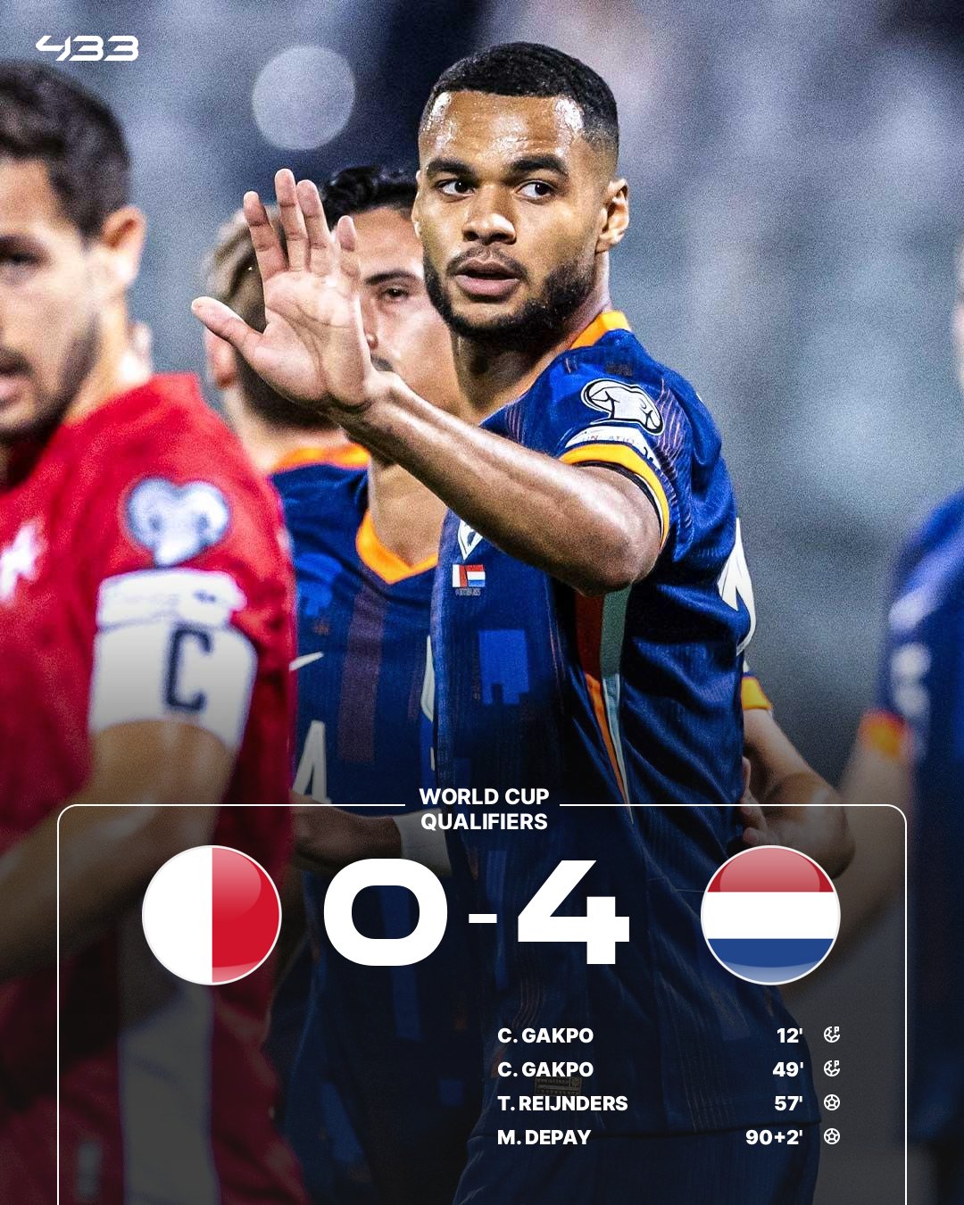 Chiến thắng trước Malta giúp Hà Lan củng cố ngôi đầu bảng G vòng loại World Cup 2026 khu vực châu Âu khi có 13 điểm, hơn đội xếp thứ 2 là Ba Lan 3 điểm. Đáng chú ý khi Hà Lan và Ba Lan mới chơi có 5 trận. Riêng 3 đội tuyển còn lại đã chơi 6 trận.
