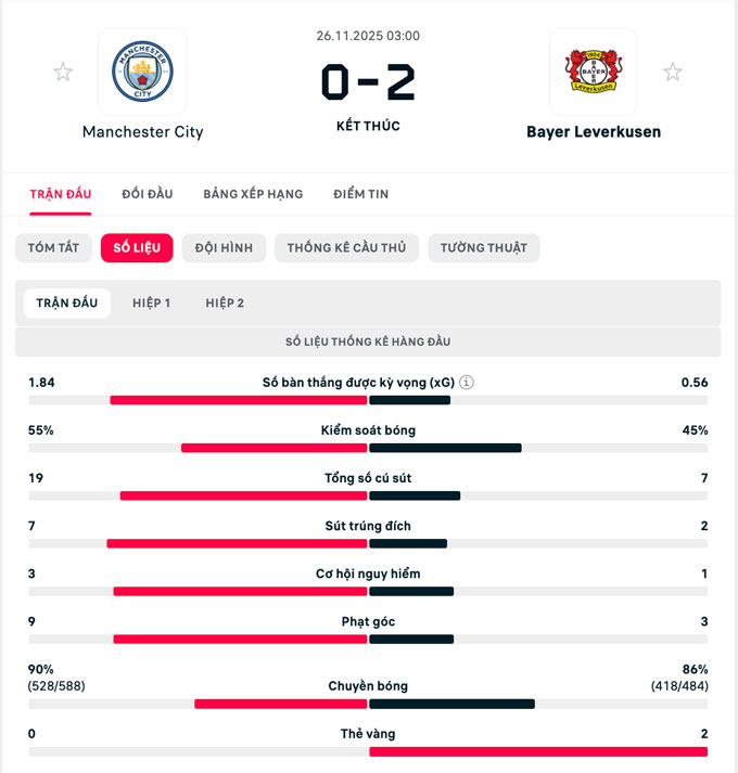 Kết quả cuối cùng của trận đấu này là 2-0 nghiêng về phía Leverkusen. Đây đã là thất bại thứ 2 liên tiếp trên mọi đấu trường của Man xanh và gióng lên hồi chuông cảnh báo với đội bóng này.