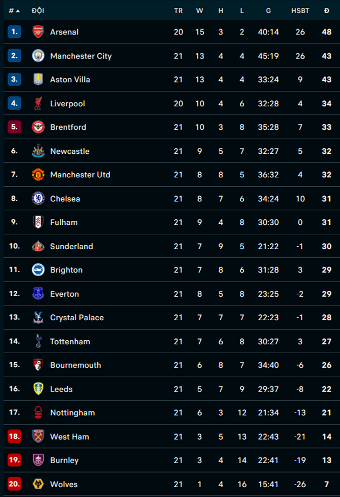 | TT | Đội bóng | Trận | +/- | Điểm |