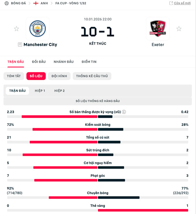 Kết quả Man City 10-1 Exeter: Tỷ số kinh hoàng