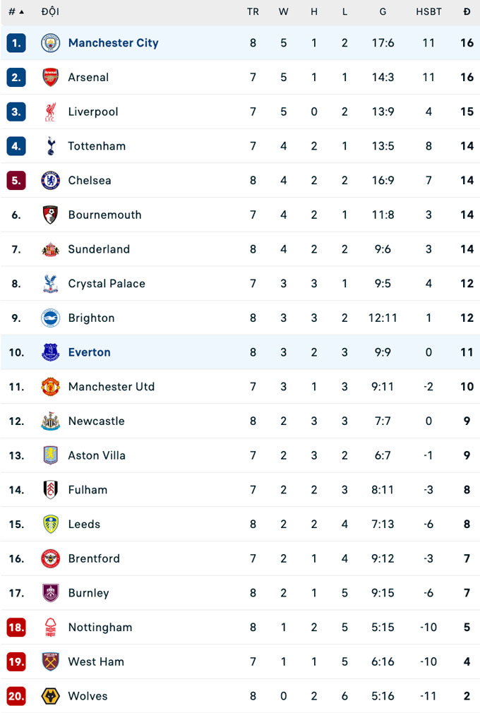 | 5 |  Manchester City | 9 | 10 | 16 |