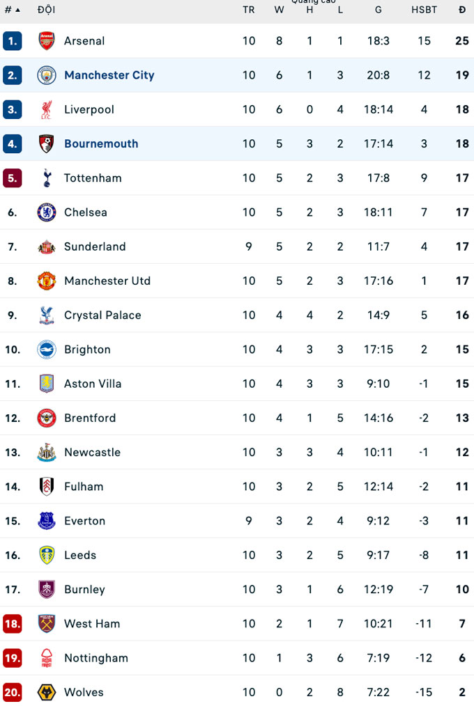 | TT | Đội bóng | Trận | +/- | Điểm |