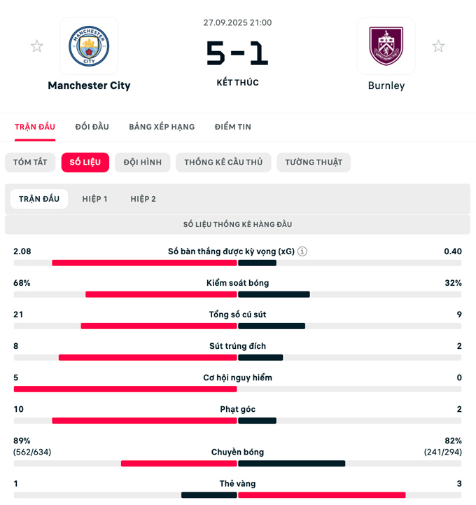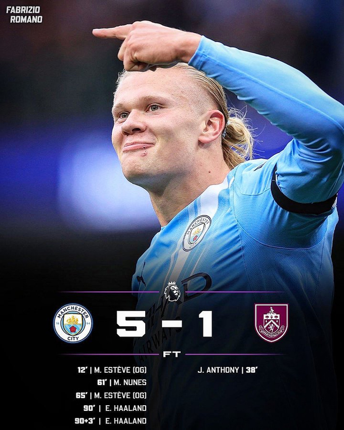 Phút 90, Haaland nâng tỷ số lên 4-1 cho Man City sau đường chuyền của Doku. Và tới phút 90+3, anh đã hoàn tất cú đúp của riêng mình đồng thời ấn định tỷ số 5-1. Chiến thắng này giúp Man City tạm leo lên vị trí thứ 4 trên bảng xếp hạng trong khi Burnley đứng thứ 17.