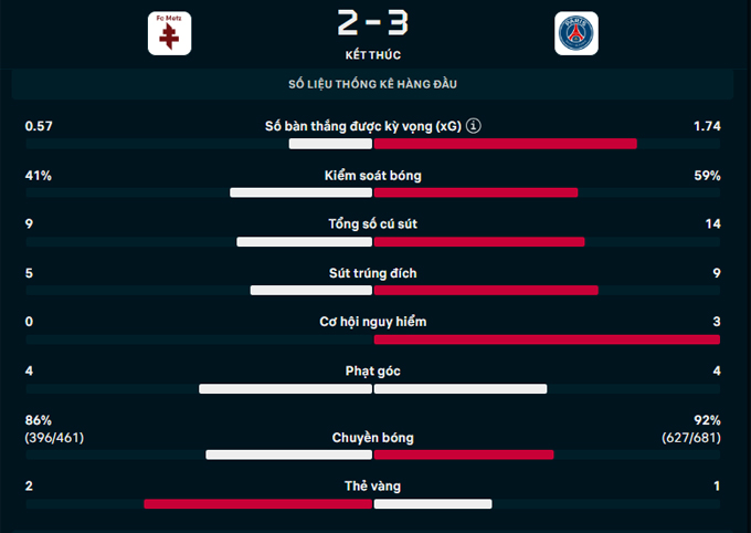 Bước sang hiệp 2, PSG duy trì sức ép về phía khung thành Metz. Kết quả, phút 63, Mbaye hoàn tất cú đúp kiến tạo để Doue ghi bàn thứ 3 cho đội khách.
