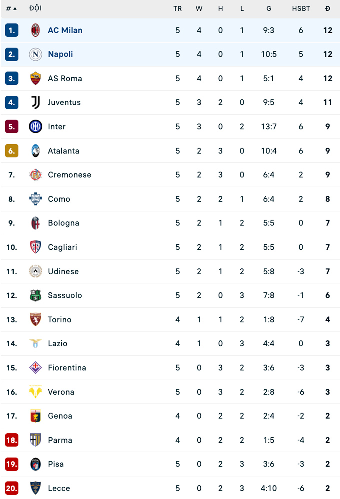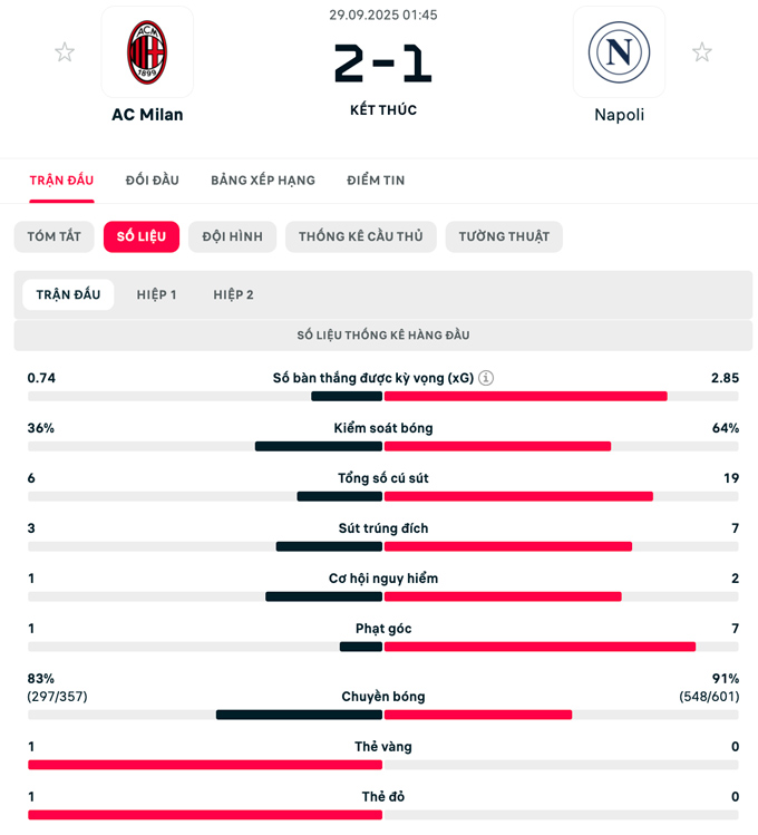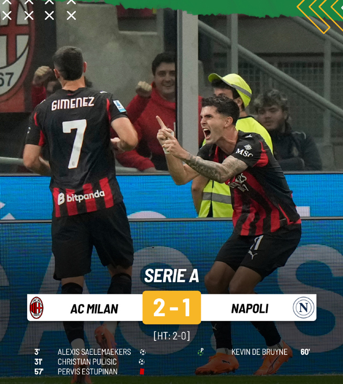 Thắng sát nút 2-1, AC Milan là đội đầu tiên đánh bại Napoli mùa này, và họ cũng chiếm luôn ngôi đầu bảng. Rossoneri bằng điểm với Napoli và Roma nhưng đều hơn hiệu số với 2 đội này.