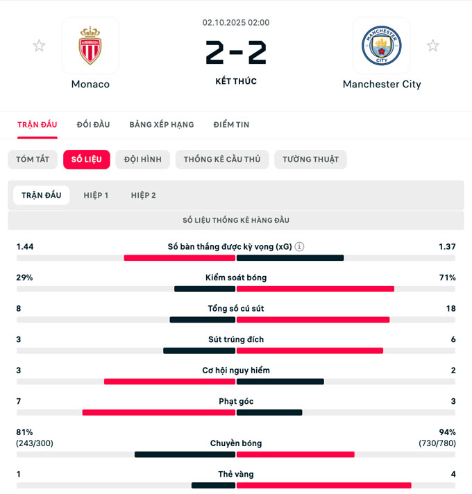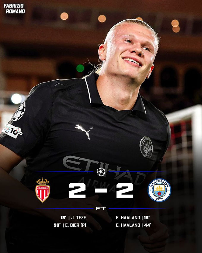 Kết quả Monaco 2-2 Man City: Haaland không cứu nổi Man City