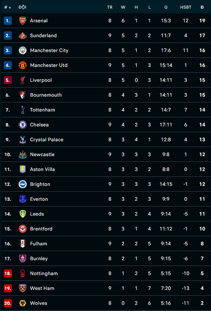 | 4 |  Sunderland | 9 | 4 | 17 |