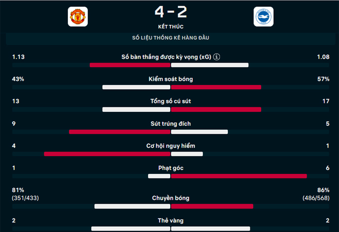 Chung cuộc, MU đánh bại Brighton với tỷ số 4-2 để có được trận thắng thứ 3 liên tiếp ở giải đấu này, chấm dứt mạch 3 trận toàn thua trước đối thủ tại Old Trafford và vươn lên đứng thứ 4 trên BXH Ngoại hạng Anh 2025/26.