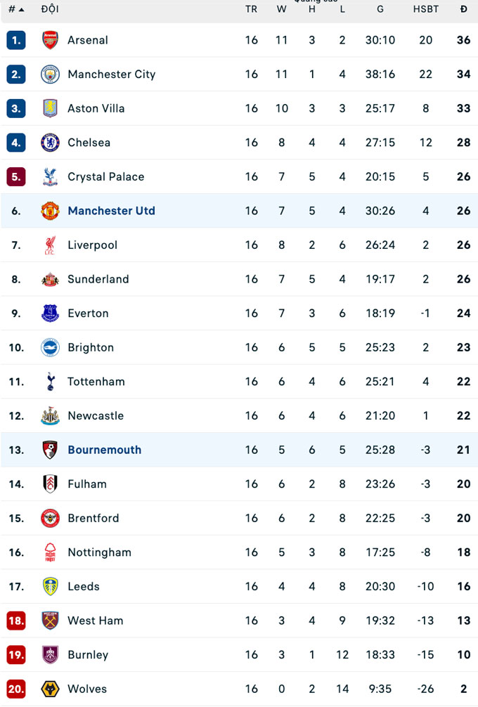Chỉ có được kết quả hoà ngay trên sân nhà, MU chỉ có thể leo lên vị trí thứ 6 trên BXH. Họ bằng điểm với Palace nhưng xếp dưới do kém hơn về hiệu số. Trong khi đó, Bournemouth đứng thứ 13.